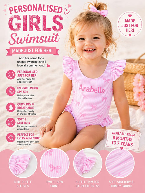 Girls Pink Bow Stripe Ruffle Swimsuit